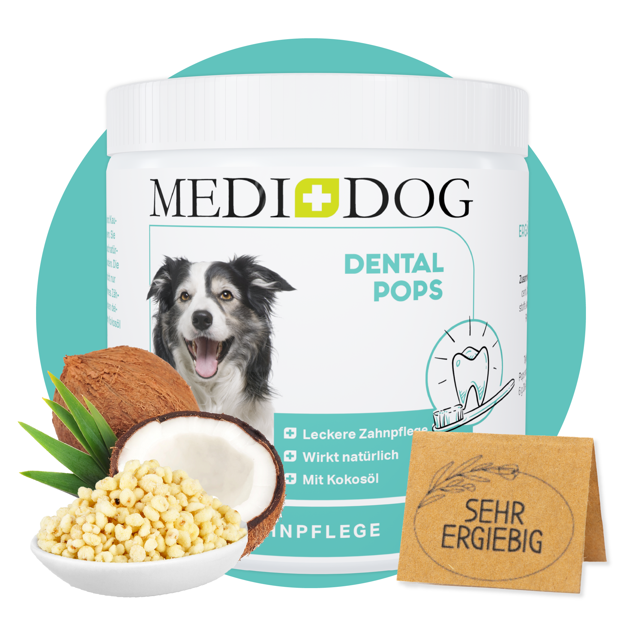 Die Medidog Dental Pops sind Kauspaß und Zahnpflege in einem. Sie sorgen für eine effektive und natürliche Zahnreinigung bei Hunden. Die soften Pops ersparen dir nicht nur mühsames und unangenehmes Zähneputzen, sondern schmecken deinem Liebling dank leckerem Kokosöl noch dazu besonders gut.
