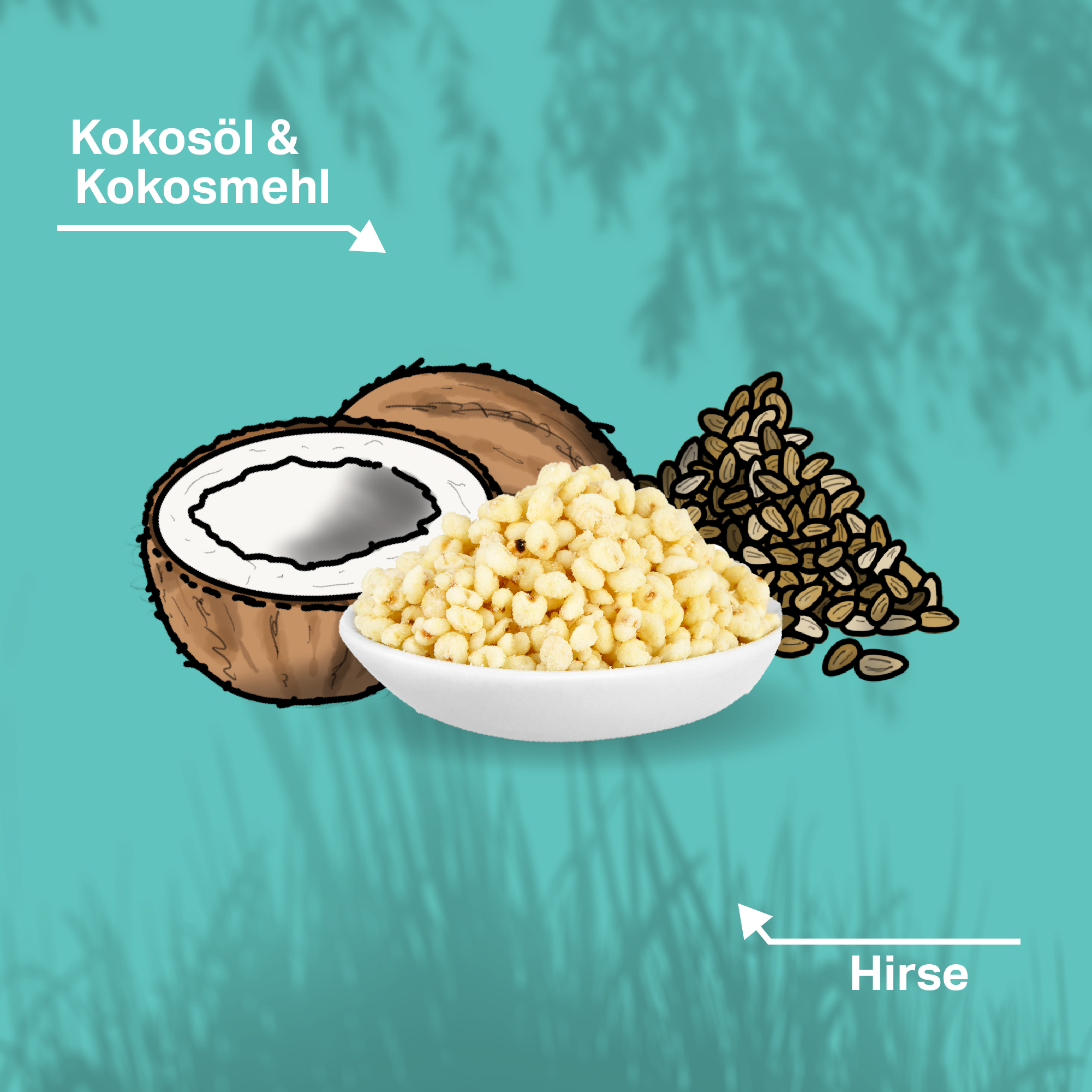 Hirse (gepoppt) 34,44 %, pflanzliches Glycerin, Kokosmehl, Kokosöl 6,89%, Mineralstoffe.
