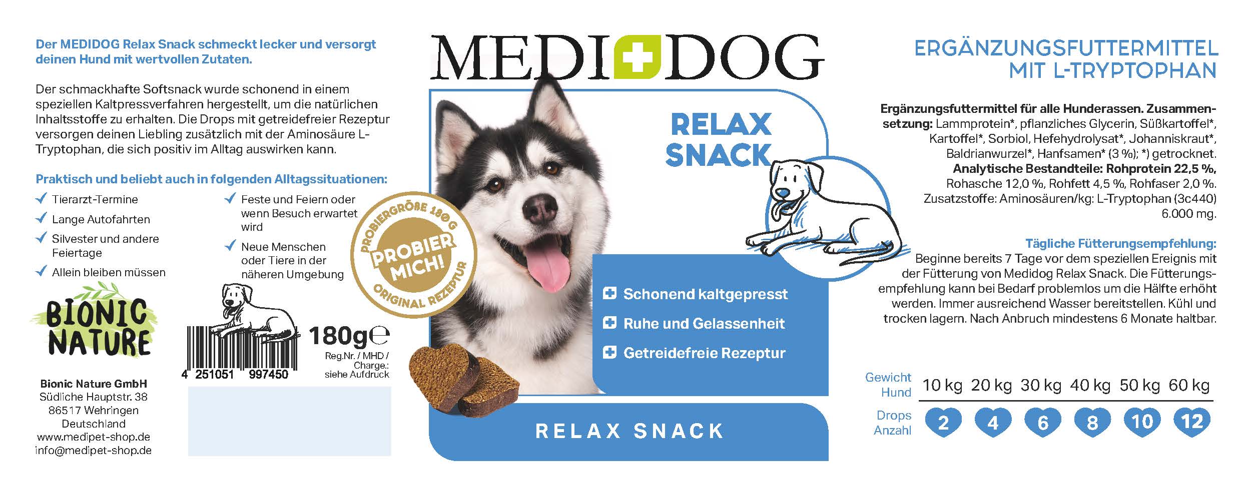 Beginne bereits 7 Tage vor dem speziellen Ereignis mit der Fütterung von Medidog Relax Snack. Die Dosierung von 2 Drops pro 10 kg kann bei Bedarf problemlos um die Hälfte erhöht werden. Trocken lagern, nach Anbruch mindestens 6 Monate haltbar.